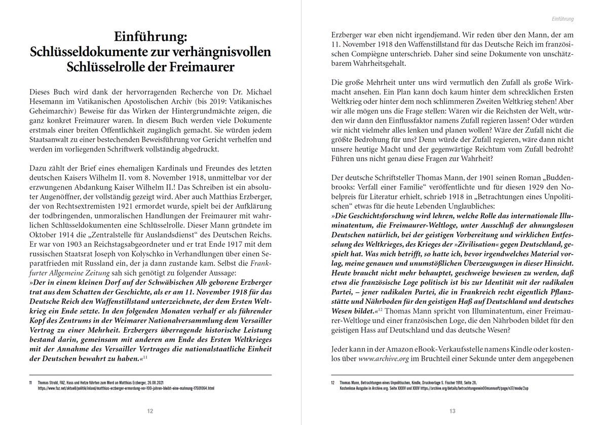 Dieses Buch will erstmals Dokumente der Öffentlichkeit aus dem Vatikanischen Apostolischen Archiv (bis 2019: Vatikanisches Geheimarchiv) zugänglich machen, die die Rolle geheimer Mächte während und nach dem Ersten Weltkrieg eindrucksvoll und beängstigend enthüllen. Dabei geht es u. a. um den Brief des damaligen Erzbischofs von Köln, Kardinal von Hartmann, einem engen Freund des letzten deutschen Kaisers, an den damaligen Apostolischen Nuntius in München, Eugenio Pacelli, den späteren Papst Pius XII. von 1939 bis 1958. Auch die in diesem Buch veröffentlichten Berichte von Matthias Erzberger sind Augenöffner über das Spiel der Freimaurer. Als Leiter der Waffenstillstandskommission unterschrieb Erzberger den Waffenstillstand von Compiègne am 11. November 1918 für das Deutsche Reich. 1921 wurde er von zwei Mitgliedern aus dem masonischen „Germanenorden“ ermordet.