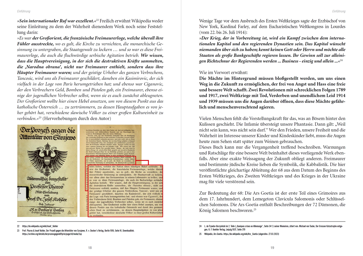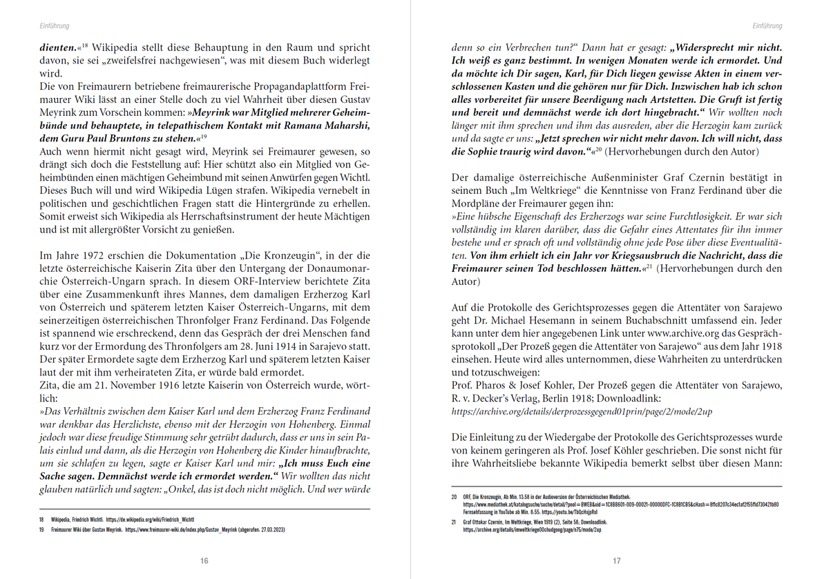 Auf die Protokolle des Gerichtsprozesses gegen die Attentäter von Sarajewo geht Dr. Michael Hesemann in seinem Buchabschnitt umfassend ein. Jeder kann unter dem hier angegebenen Link unter www.archive.org das Gesprächsprotokoll „Der Prozeß gegen die Attentäter von Sarajewo“ aus dem Jahr 1918 einsehen. Heute wird alles unternommen, diese Wahrheiten zu unterdrücken und totzuschweigen: Prof. Pharos & Josef Kohler, Der Prozeß gegen die Attentäter von Sarajewo, R. v. Decker’s Verlag, Berlin 1918; Downloadlink: https://archive.org/details/derprozessgegend01prin/page/2/mode/2up