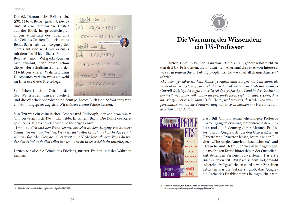 Vielen Menschen fehlt die Vorstellungskraft für das, was an Bösem hinter den Kulissen geschieht. Die Infamie übersteigt unsere Phantasie. Dann gilt: „Weil nicht sein kann, was nicht sein darf.“ Wer den Frieden, unsere Freiheit und die Wahrheit im Interesse unserer Kinder und Kindeskinder liebt, muss die Augen heute zum Sehen statt später zum Weinen gebrauchen. Dieses Buch kann nur die Vergangenheit treffend beschreiben. Warnungen und Ratschläge für eine bessere Welt beinhaltet dieses vorliegende Werk ebenfalls. Aber eine exakte Weissagung der Zukunft obliegt anderen. Freimaurer und bestimmte jüdische Kreise lieben die Symbolik, die Kabbalistik. Die hier veröffentlichte gleichartige Ableitung der 68 aus dem Datum des Beginns des Ersten Weltkrieges, des Zweiten Weltkrieges und des Krieges in der Ukraine mag für viele verstörend sein.