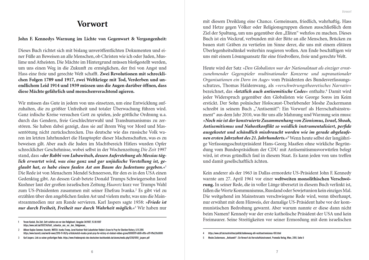 Wir müssen das Gute in jedem von uns einsetzen, um eine Entwicklung aufzuhalten, die zu größter Unfreiheit und totaler Überwachung führen wird. Ganz irdische Kreise versuchen Gott zu spielen, jede göttliche Ordnung u.a. durch das Gendern, freie Geschlechterwahl und Transhumanismus zu zerstören. Sie haben dabei gezeigt, dass sie auf ihrem Weg vor Mord und Massentötung nicht zurückschrecken. Das deutsche wie das russische Volk waren im letzten Jahrhundert die Hauptopfer dieser Machenschaften, was es zu beweisen gilt. Aber auch die Juden im Machtbereich Hitlers wurden Opfer schrecklicher Geschehnisse, wobei selbst in der Wochenzeitung Die Zeit 1997 stand, dass »der Rabbi von Lubawitsch, dessen Auferstehung als Messias täglich erwartet wird, was eine ganz und gar unjüdische Vorstellung ist, geglaubt hat, es habe einen faulen Ast am Baum des Judentums gegeben.«[1] Die Rede ist von Menachem Mendel Schneerson, für den es in den USA einen Gedenktag gibt. An dessen Grab betete Donald Trumps Schwiegersohn Jared Kushner laut der großen israelischen Zeitung Haaretz kurz vor Trumps Wahl zum US-Präsidenten zusammen mit seiner Ehefrau Ivanka.[2] Es gibt viel zu erzählen über den angeblichen faulen Ast und vielem mehr, was uns die Mainstreammedien nur am Rande servieren. Karl Jaspers sagte 1958: »Friede ist nur durch Freiheit, Freiheit nur durch Wahrheit möglich.«[3] Wir haben nur mit diesem Dreiklang eine Chance. Gemeinsam, friedlich, wahrhaftig. Hass und Hetze gegen Völker oder Religionsgruppen dienen ausschließlich dem Ziel der Spaltung, um uns gegenüber den „Eliten“ wehrlos zu machen. Dieses Buch ist ein Weckruf, verbunden mit der Bitte an alle Menschen, Brücken zu bauen statt Gräben zu vertiefen im Sinne derer, die uns mit einem elitären Überlegenheitsdünkel weiterhin reagieren wollen. Am Ende beschäftigen wir uns mit einem Lösungsansatz für eine friedvollere, freie und gerechte Welt.
