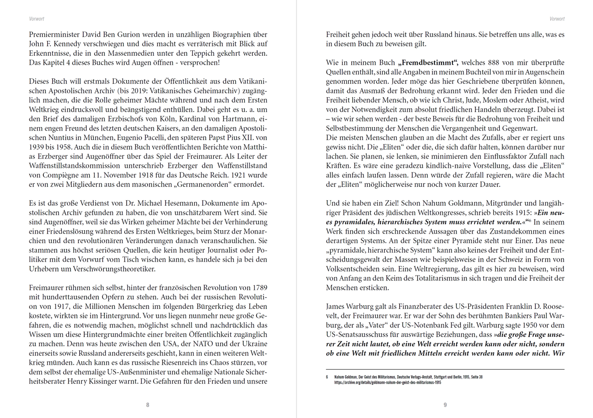 Es ist das große Verdienst von Dr. Michael Hesemann, Dokumente im Apostolischen Archiv gefunden zu haben, die von unschätzbarem Wert sind. Sie sind Augenöffner, weil sie das Wirken geheimer Mächte bei der Verhinderung einer Friedenslösung während des Ersten Weltkrieges, beim Sturz der Monarchien und den revolutionären Veränderungen danach veranschaulichen. Sie stammen aus höchst seriösen Quellen, die kein heutiger Journalist oder Politiker mit dem Vorwurf vom Tisch wischen kann, es handele sich ja bei den Urhebern um Verschwörungstheoretiker.