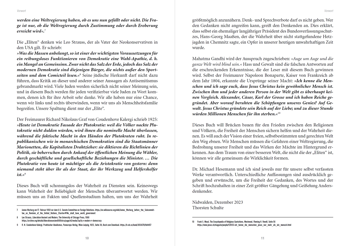 Dieses Buch will Brücken bauen für den Frieden zwischen den Religionen und Völkern, die Freiheit der Menschen sichern helfen und der Wahrheit dienen. Es will auch der Vision einer freien, selbstbestimmten und gerechten Welt den Weg ebnen. Wir Menschen müssen die Gefahren einer Weltregierung, die Bedrohung unserer Freiheit und das Wirken der Mächte im Hintergrund erkennen. Aus dem Traum von einer besseren Welt, die nicht die der „Eliten“ ist, können wir alle gemeinsam die Wirklichkeit formen.